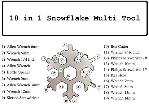 ❆18-in-1 Snowflake Multi-tool: Slotted Screwdriver and Field Cutter, Rope Cutter, Bottle Opener, Key Gap, Phillips Screwdriver: Metric (millimeter) – 3; SAE (inch) – 1/8, Allen Wrench: Metric (millimeter) – 3-4-5-6-8-9; SAE (inch) – 1/8-5/32-3/16-1/4-11/32-6/16, Outer Hex Wrench: Metric (millimeter) – 7-8-9-10-11-13; SAE (inch) – 9/32-11/32-6/16-3/8-7/16-1/2