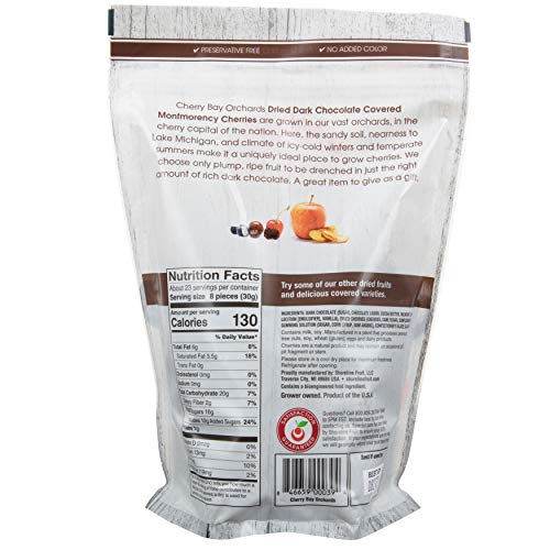 Every thing is best with chocolate! Cherry Bay Orchards Dried Darkish Chocolate Lined Montmorency Cherries are grown in our huge orchards, within the cherry capital of the nation. Right here, the sandy soil, nearness to Lake Michigan, and local weather of icy-cold winters and temperate summers make it a uniquely excellent place to develop cherries. Makes an amazing reward for chocolate lovers! Pack of Two 24oz baggage of darkish chocolate coated cherries. Incorporates milk and soy. Manufactured on tools that additionally processes peanuts, tree nuts, wheat, and eggs.