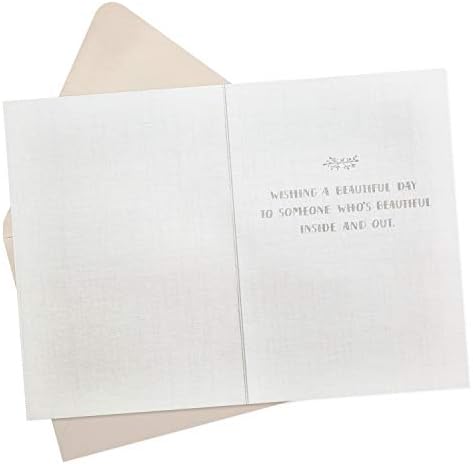 Cowl options stunning paper craft flowers, accented with glitter, on a textured background. Inside reads: “Wishing an exquisite day to somebody who’s stunning inside and outside.”