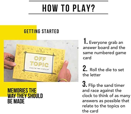 How To Play: Draw a card to set the subjects, and roll the die to set the letter that your responses should start with. Flip the sand timer and also you’re off! Race in opposition to time to jot down down solutions for every matter that start with the letter rolled.
