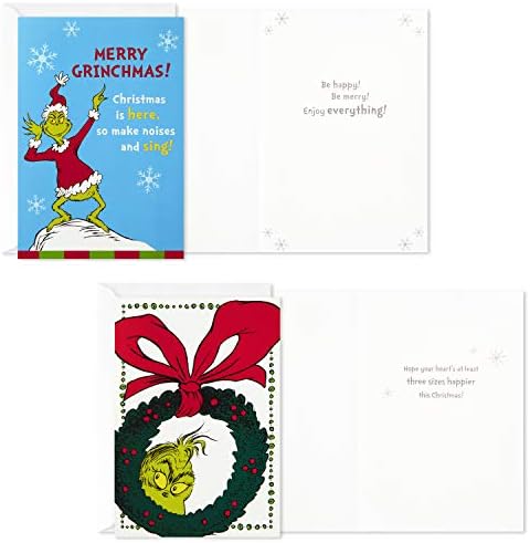 Vacation playing cards function 4 distinctive designs that includes Dr. Seuss’s Grinch. Inside message for every design: Grinch listening and pointing design reads, “Be comfortable! Be merry! get pleasure from the whole lot!” Grinch trying via wreath design reads, “Hope your coronary heart’s a minimum of three sizes happier this Christmas!” Grinch hand holding decoration design reads, “. . . and your veriest merriest Christmas of all!” Grinch holding Christmas tree design reads, “Have your self a merry little Grinchmas!”