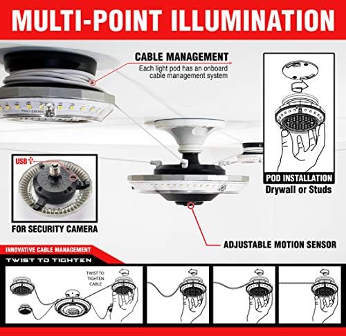 M. P. I. stands for Multi-Level Illumination. Not like a standard mild fixture which has a single level of illumination, the MPI creates 5 factors of sunshine all out of your current mild fixture! These 5 factors unfold mild to all corners of the room, filling the complete house and decreasing shadows brought on by conventional mild output. The system installs in minutes and is powered by a regular ceiling fixture, eliminating the necessity to rent an electrician to correctly mild massive areas like a storage, attic, basement, or any room in your house. The principle hub is as straightforward to put in as a lightweight bulb and easily screws into your current mild fixture. Then, place and mount the 4 satellite tv for pc mild pods anyplace within the room, as much as 9. 5 ft away from the hub. The facility wires for the satellite tv for pc mild pods plug straight into the principle hub and any extra cable is retracted by the cable upkeep system designed into every pod. The top result’s 5 factors of illumination filling the complete room with 7500 lumens of sunshine. Practically 10x the sunshine output of a standard mild bulb. The MPI is supplied with the latest tech in movement sensing and may detect even the slightest actions. Instantly upon getting into the room, or because the storage door budges, the complete space is flooded with mild. This movement sensing expertise is totally adjustable. Flip the sensitivity to excessive for big rooms and the M. P. I. will detect motion from as much as 20’ away. Flip the sensitivity down for smaller rooms, or flip this characteristic off to regulate the MPI with the sunshine change as you’d any conventional mild. As well as, the MPI has a characteristic to briefly override the movement sensor along with your current mild change. Lastly, the M. P. I. presents a USB energy port in the principle hub permitting customers to simply plug any safety digital camera straight into the principle hub and energy it from that single energy supply. Cameras will be positioned anyplace on the ceiling with out the necessity to run lengthy extension cords up the wall and throughout the ceiling.