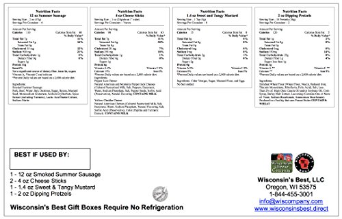 THIS GOURMET FOOD GIFT INCLUDES – (1) 4 oz 100% Wisconsin Cheddar Cheese and (1) 4 oz 100% Wisconsin Pepper Jack Cheese (1) 2 oz Gourmand Dipping Pretzels with (1) 1.4 oz Candy and Tangy Mustard THIS IS A TRADEMARK ITEM – To not be bought by Third Events.