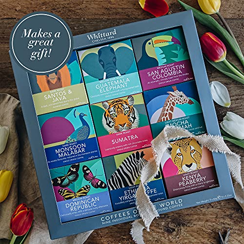9 COFFEE VARIETIES – This present set consists of 3 Darkish Roasts: Santos & Java, Monsoon Malabar, Sumatra – 2 Medium Roasts: San Agustin Colombia, Dominican Republic – 1 Medium-Darkish Roast: Guatemala Elephant – 1 Gentle-Medium Roast: Mocha Djimmah – 2 Gentle Roasts: Ethiopia Yirgacheffe & Kenya Peaberry. All 100% floor Arabica espresso.