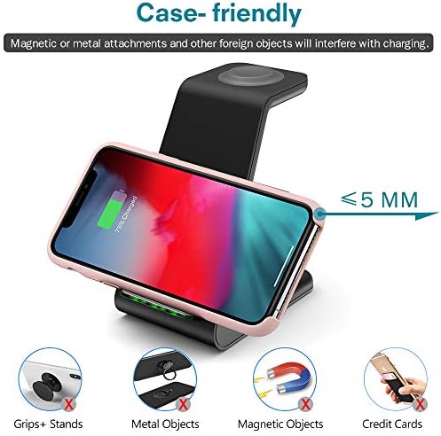 HIGH-QUALITY WIRELESS CHARGER: Wi-fi charger doesn’t scratch iPhone/iwatch/airpods to dam the display or the perimeters when charging the system. The charging stand hides the iWatch and AirPods Professional cables, saving you area in your desk. (The charging distance is 0-5mm, please do not put on protecting case which is over 5mm thick).