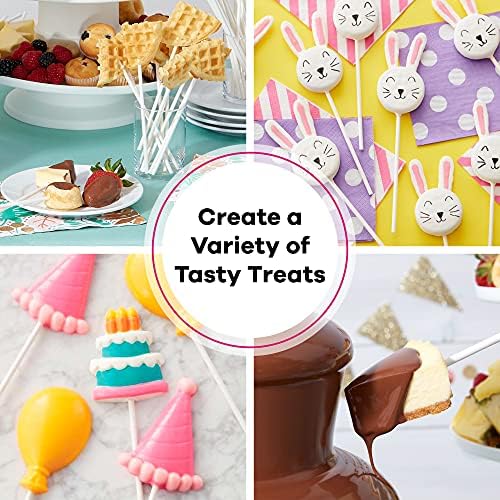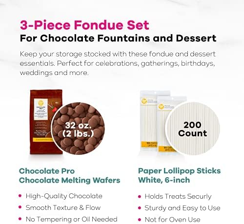 Features a 2 lb package deal of melting chocolate wafers and 200 6-inch white fondue cake pop sticks