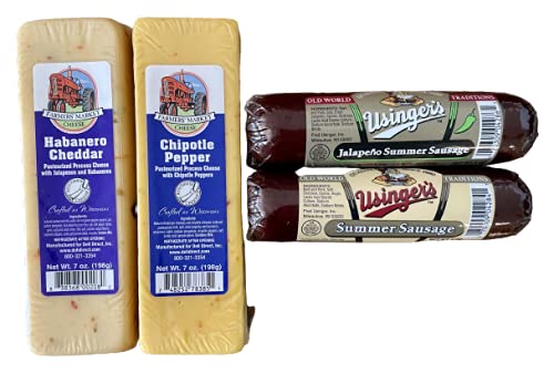INCLUDES VARIETY OF TOP QUALITY USINGER MEATS AND WISCONSIN CHEESES. Premium present set contains (1) Usinger’s 5 oz Authentic Summer time Sausage, (1) Usingers 5 oz Jalapeno Sausage, (1) Farmers’ Market 7 oz Habanero Cheese, and (1) Farmers’ Market 7 oz Chipotle Cheese